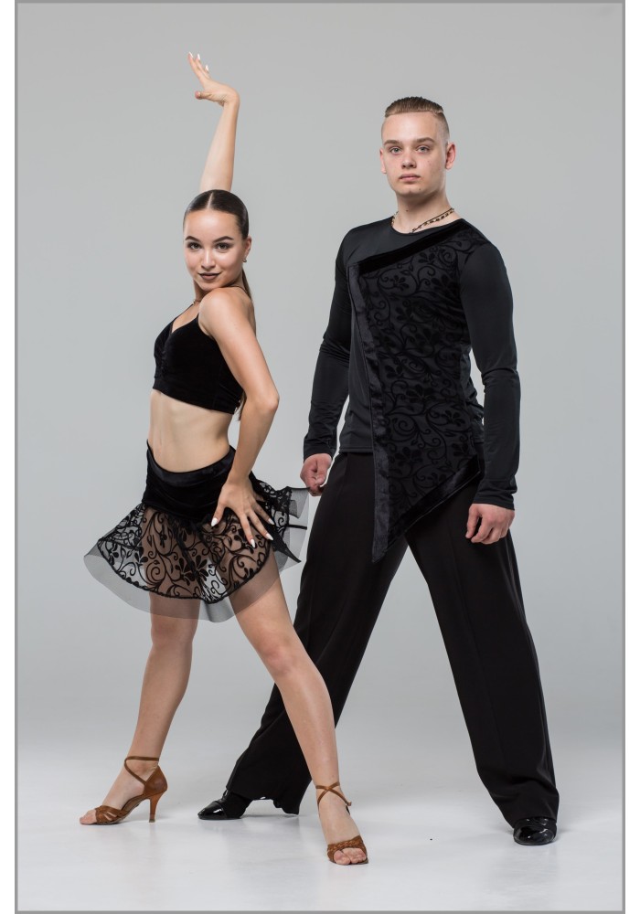 Latin Skirt with two-layer, the upper layer is made of velour, the lower layer is one sun made of flock mesh. A wide reguilin is sewn on the bottom of the skirt.