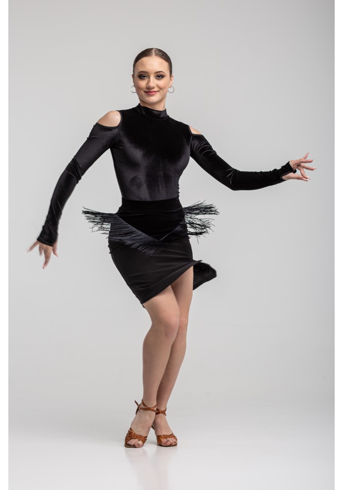 The stylish Latin skirt, with a V-shaped yoke made of velour. A fringe is sewn along the yoke sewing line. This model has a slit on one leg.The skirt is made of velour and oil jersey....