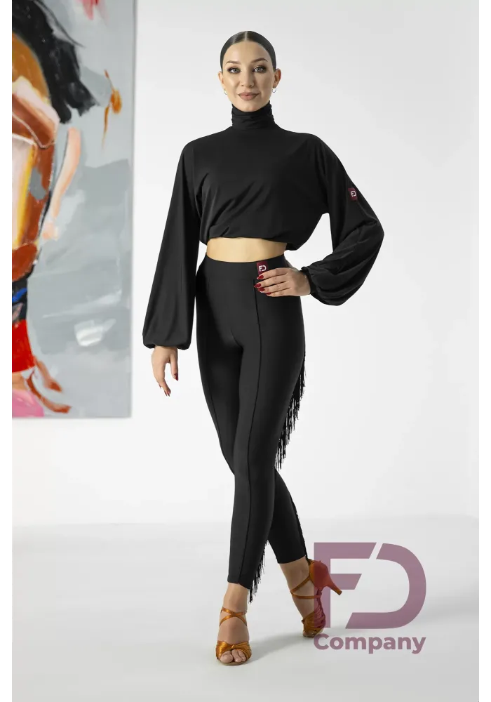 Leggings Leggings shortened for the Latin program, on the belt with an elastic band. There is a voluminous arrow on the front, fringe is sewn into the vertical relief along the back halves. The product is made of oil je...